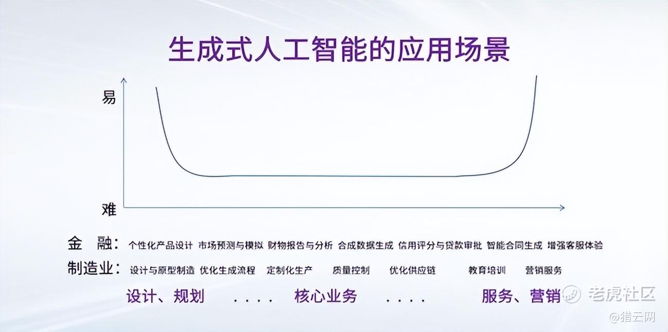在过去一年多的时间,大模型落地应用与应用场景的复杂程度之间呈现出“U”型走势。在生成式AI的众多应用场景中,高阶应用如设计、规划等,以及低阶应用如服务、营销等是相对容易实现的,而涉及企业关键业务领域的应用场景却是一片“洼地”。