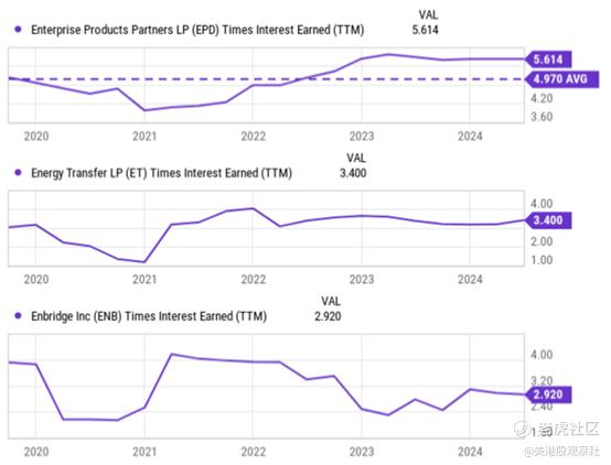 在下行风险方面,除了前面提到的不利因素,投资者还需要了解他们的融资成本问题。如前所述,Enbridge极有可能通过有机现金可持续地为其正在进行的扩建项目和新举措提供资金。然而,投资者需要意识到,与其他同行相比,Enbridge的杠杆率要高得多。例如,下一个图表显示了Enbridge与其他两个同行:Enterprise Products Partners和Energy Transfer的利息倍数(TIE)的比较。如图所示,安桥目前的TIE指数为2.92,明显低于Energy Transfer的3.40,也远低于Enterprise Products Partners的5.61及其长期平均值4.97。
