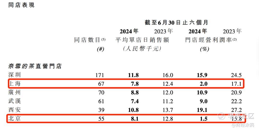 奈雪在深圳、上海、广州和北京门店分别有228家、120家、111家和90家,门店平均单店日销售额分别为10000元、6800元、8000元和7500元,门店经营利润率分别为14.7%、1.4%、10.3%和2.2%。一线城市2024年中期平均单店日销售额为8600元,去年同期为13800元,门店经营利润率为9.9%,去年同期为21.2%;新一线城市平均单店日销售额为6600元,去年同期为10700元,门店经营利润率为6.6%,去年同期为20%。