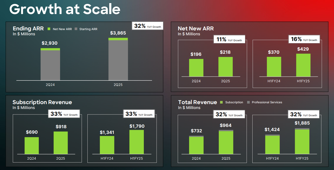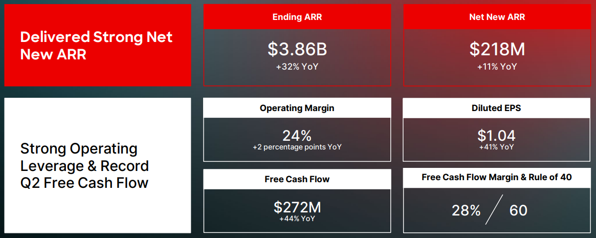 年度经常性收入(ARR):截至2024年7月31日,ARR增长32%至38.6亿美元,其中本季度新增ARR为2.176亿美元。