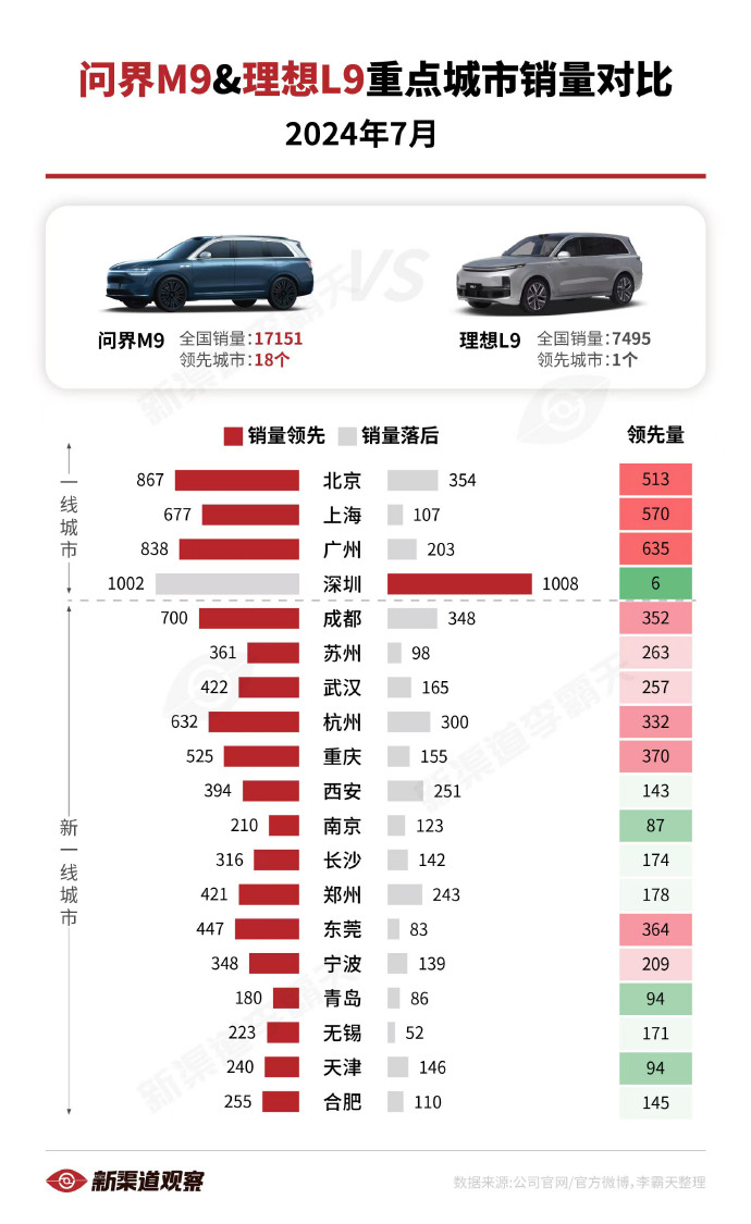 从重点城市分布来看,问界M9占据了18个城市的领先,理想L9依旧在深圳领先