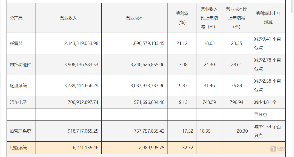 钛媒体APP还发现,不仅仅是电驱系统,公司其他业务的毛利率也都有所下滑(如上图),减震器、内饰、底盘、汽车电子、热管理系统的毛利率分别下滑了3.41%、2.78%、2.58%、4.81%、1.34%。但由于新开展了电驱系统业务,其超50%的毛利率削弱了各项业务毛利率下滑的影响,今年上半年,公司综合毛利率为21.35%,对比去年同期只减少了1.23%。