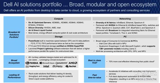 ➢如下图所示,戴尔在计算、网络、存储和个人电脑市场拥有技术优势,未来将支持人工智能训练和推理。戴尔的整体人工智能产品组合可以提供从桌面/边缘到数据中心/云的解决方案。此外,戴尔一直在扩大与英伟达、AMD和英特尔等主要人工智能供应商的合作伙伴关系。