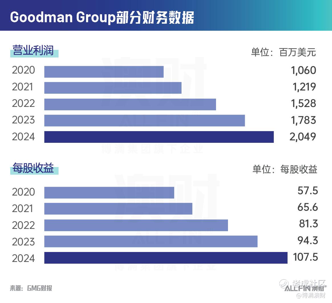 2024财年内, Goodman Group的经营利润达20.49亿澳元,同比增长15%;每股收益(EPS)同比增长14%,两项关键指标在过去5年内都保持稳定增长;管理的总资产规模也达到了创纪录的787亿澳元。