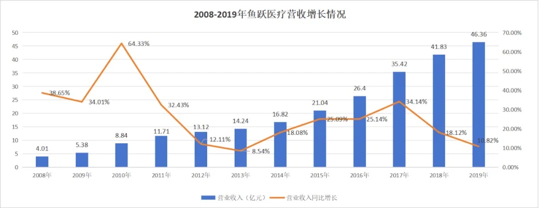 图:鱼跃医疗2008—2019年营收及增速,来源:锦缎研究院