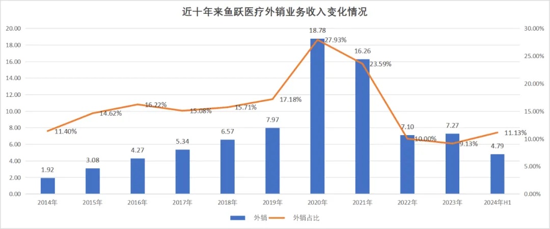 可是,自2020年之后,鱼跃医疗的海外营收数额和占比持续降低,2023年,海外营收占比更是低至了个位数,成了十年来的最低水平。即便是今年上半年实现外销收入4.79亿元,同比增长 30.19%,占比也不过提升至11%,仍处于历史低位。