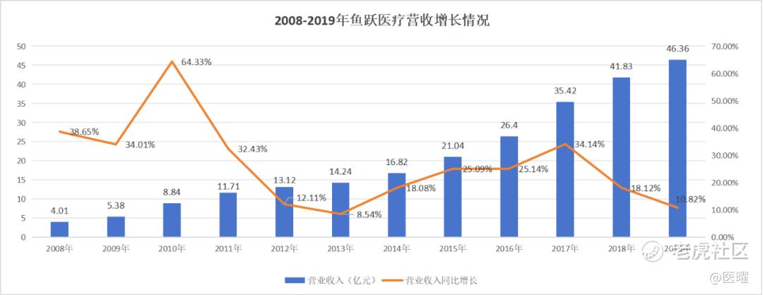 图:鱼跃医疗2008—2019年营收及增速,来源:锦缎研究院