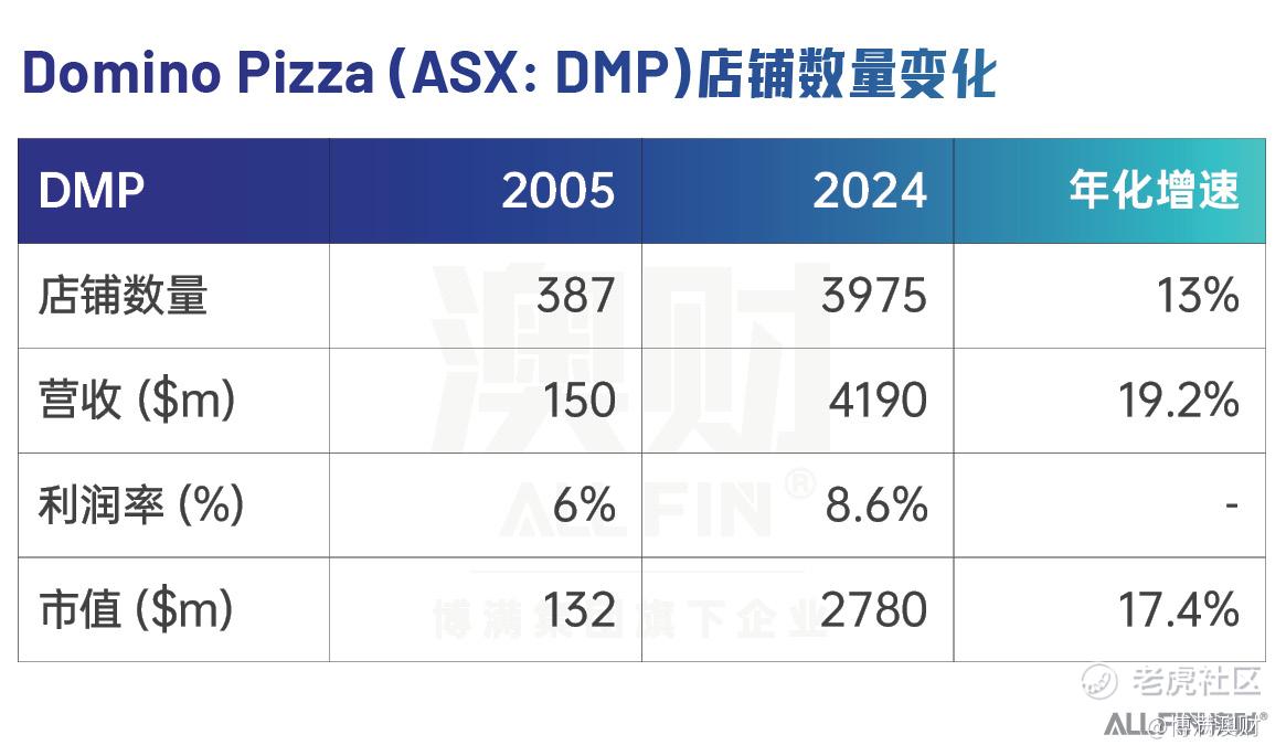 而从最新的财报来看,截至FY24,包括加盟商在内,Domino Pizza拥有3975家店铺,营收41亿,净利润达到1.2亿澳元。而Collins Foods拥有381家店铺,营收近15亿澳元,净利润7600万澳元。