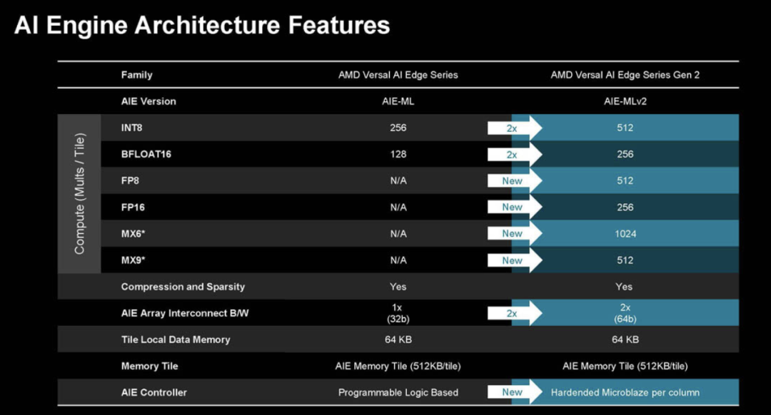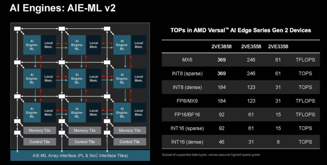 新一代产品中,AMD 对 Xilinx 衍生的 AI 引擎进行了升级,引入了 AIE-ML v2(第二代 AI 引擎-机器学习),提高了每瓦性能。