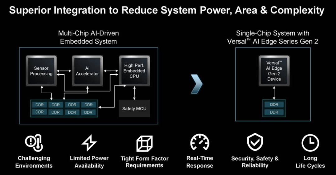 AMD Versal AI Edge Gen 2 继续沿用其前代产品的核心价值主张,即通过单个芯片替代多个芯片,简化了系统设计并提高了性能。