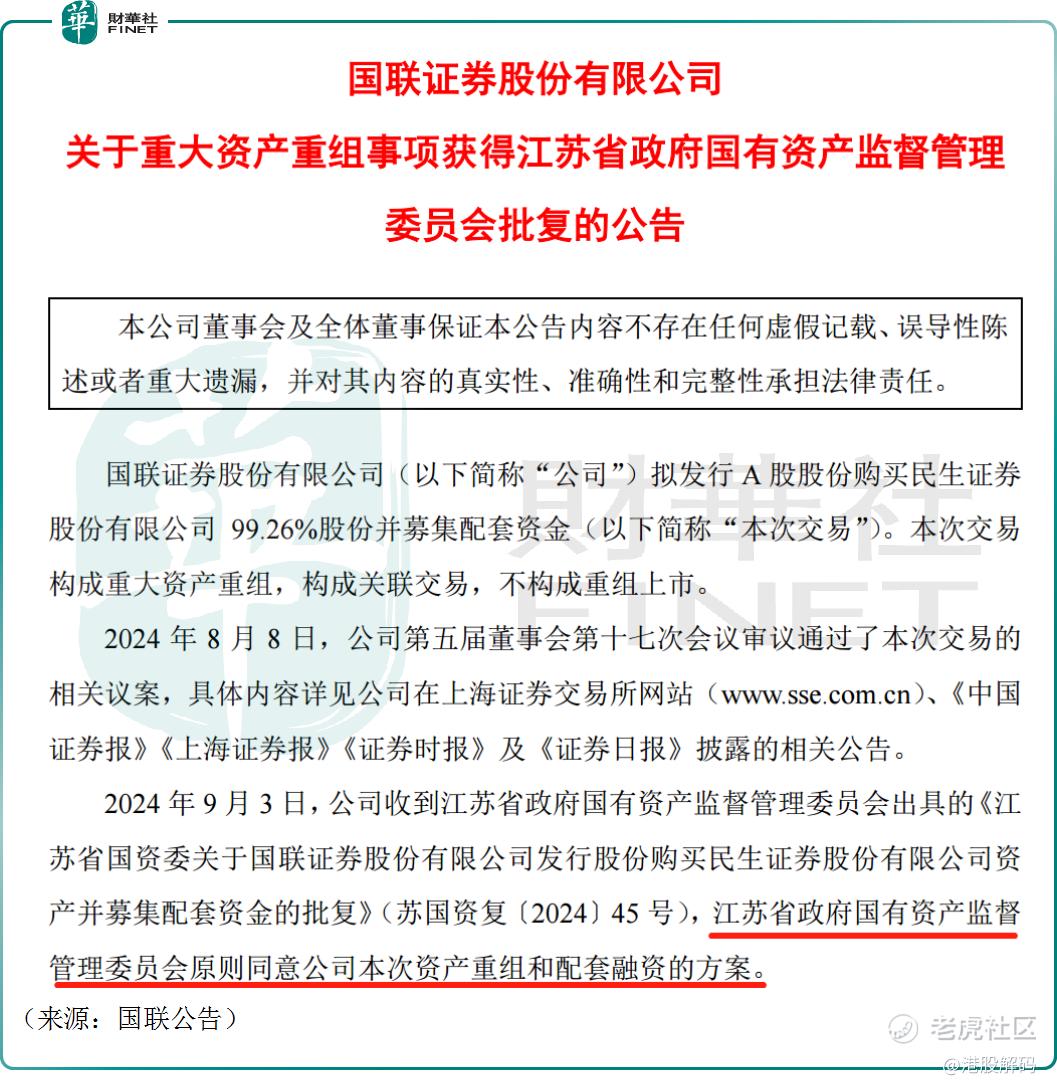 9月3日, $国联证券(601456)$ 发布公告称,收到江苏省国资委出具的批复,原则同意国联证券该次资产重组和配套融资的方案。