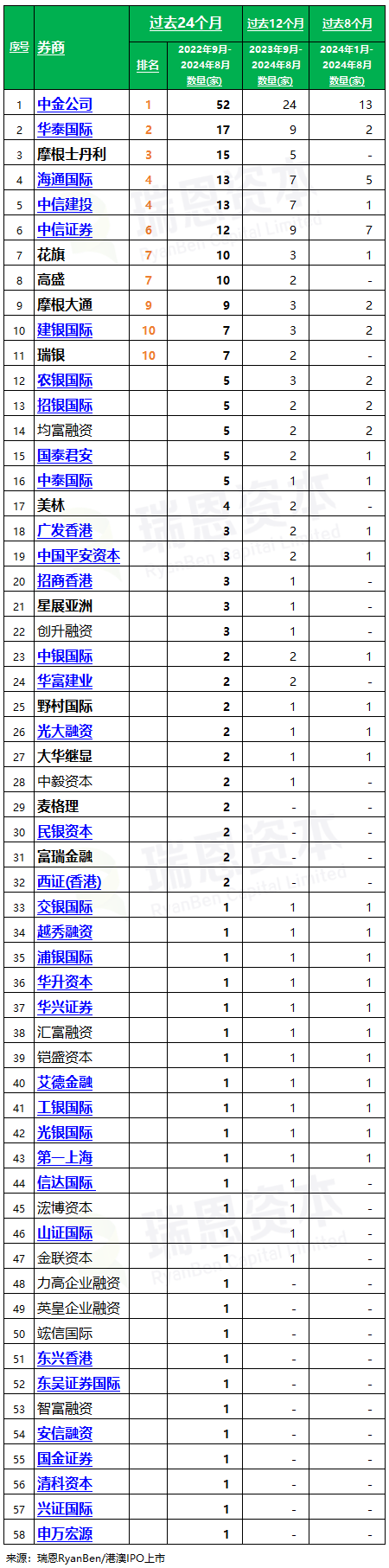 香港上市中介机构“IPO保荐人”排行榜:中金、华泰、摩根士丹利、海通、中信建投,位列前五 (截至2024年8月)