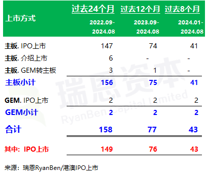 在过去的24个月(2022年9月至2024年8月)香港新上市公司 158家,主板上市156家(包括:147家IPO上市、6家介绍上市、3家GEM转主板),GEM(创业板)上市2家;