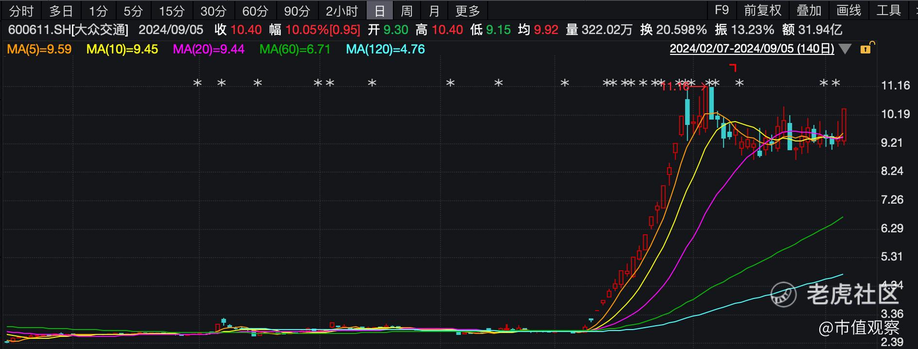 9月5日,盘踞许久的妖股大众交通,又涨停了。近60个交易日,公司股价涨幅超过280%。