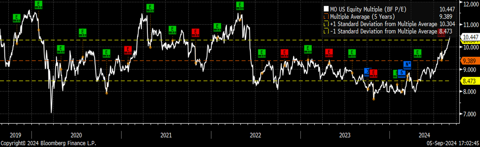 目前MO的估值水平超过2年平均的6个百分点,而PM则超过2年平均的12个百分点。