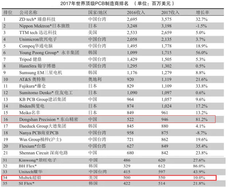 以2017年的收入测算,将Multek全部并表后,东山精密的营收将达14.96亿美元,跃居全球PCB行业第8位。