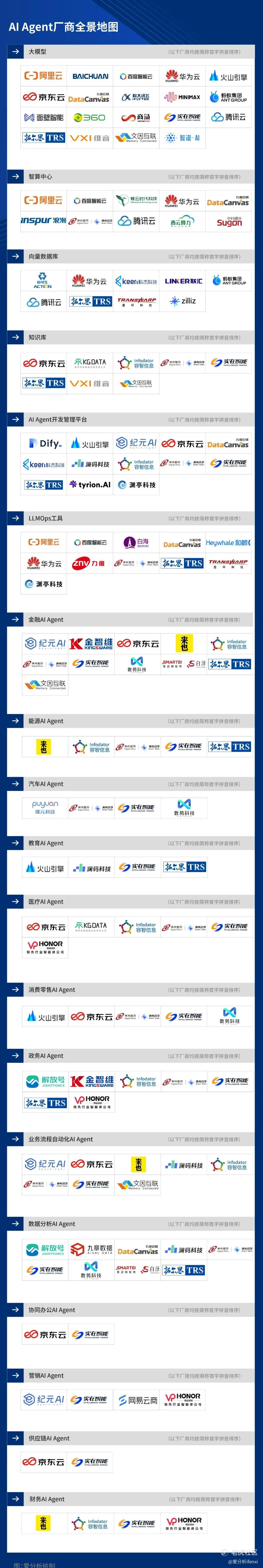 爱分析认为,AI Agent市场从技术架构角度可以划分为基础层、平台层和应用层。基础层是指支持AI gent的基础环境,包括大模型、算力基础设施和数据基础设施。平台层是基础层和应用层之间的“桥梁”,有利于大模型在各种实际场景以AI Agent的形态快速落地,包括AI Agent开发管理平台、LLMOps工具等。应用层是指各类场景的AI Agent,既有金融、能源、汽车等行业场景的AI Agent,也有业务流程自动化、数据分析、协同办公等通用场景的AI Agent。AI Agent市场划分详见下图。