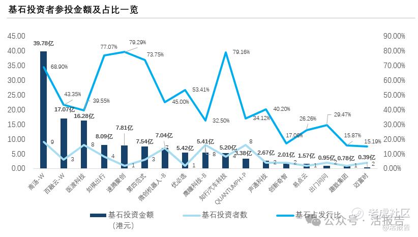 据LiveReport大数据统计,于22家AI新股公司中,有17家公司拥有基石,且共计66家基石投资者参投(含复投),合计投资金额约131.38亿港元,占募资总额的46.43%,平均每家公司获得的基石投资者金额约为7.73亿港元。