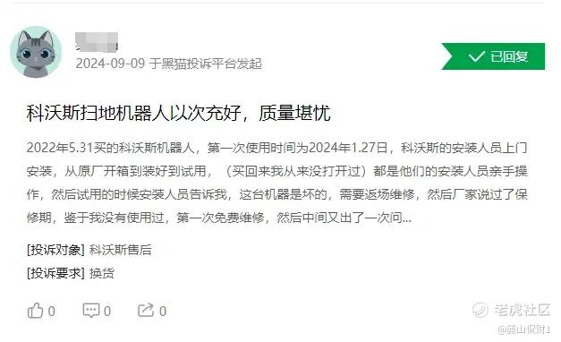 在小红书、抖音以及黑猫投诉平台上,消费者对科沃斯产品质量问题和售后费用问题的投诉层出不穷。截至9月9日,科沃斯在黑猫投诉上的投诉量已累计达到3630条。最近30天,关于科沃斯的投诉量85条,几乎每天3条,而解决量仅25条,不足三分之一。科沃斯旗下另一主力品牌“添可”的投诉量更高达8089条,最近30天的投诉量89条,解决率不到一半。