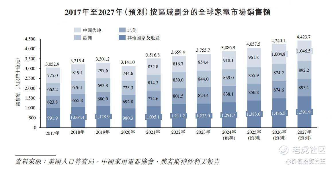 从全球家电市场销售额来看,虽然中国是第一大市场,但和北美、欧洲之间的差距不大,加上其他国家的销售额更高,即使未来我们的经济迎来失去的X年,美的也有望凭借海外扩张抵消一部分下滑: