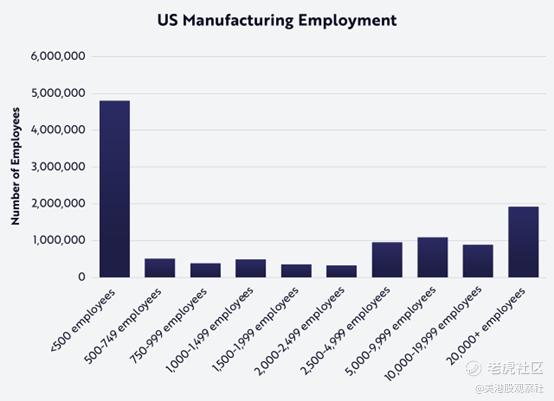 根据Ark的研究,40%的美国制造业员工在小型公司工作。在下图中,小型公司雇佣的员工少于500人。