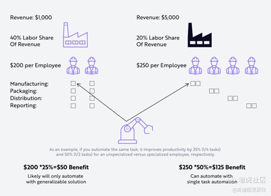 由于通用自动化解决方案——适用于多项任务的解决方案——的演变速度没有特定任务的自动化解决方案快,小型公司通常有不成比例的可自动化但尚未自动化的任务数量,这些任务将从像人型机器人这样的通用解决方案中受益。