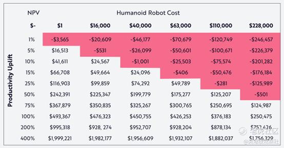 在更有可能的情况下,人形机器人将以更高的价格点首次亮相,并且比人类同行的能力要低得多。根据Ark的研究,当人形机器人在其净现值(NPV)的转折点上比人类雇员更具经济可行性时,它们将变得更具经济吸引力,这些转折点平衡了人形机器人的成本和它们将实现的生产力提升,如下图所示。例如,以16000美元的成本,一个人形机器人只需要比人类同行提供略高于5%的生产力提升,就能变得经济上可行。作为参考,马斯克曾建议,“人形机器人的单位质量复杂性要高得多,但我仍然认为它的成本不到汽车的一半。”