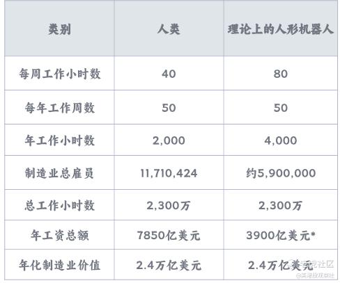 本文将重点关注美国制造业中的机器人机会。根据Ark的研究,美国制造业雇佣了近1200万人,他们每年工作约230亿小时,工资约7850亿美元,产出价值约2.4万亿美元,如下图所示。如果用机器人代替所有人类工人,让他们每天工作16个小时,那么制造业只需要约590万个机器人——相当于目前雇佣的人类工人数量的一半——就能实现同样水平的制造业产出,如下图所示。