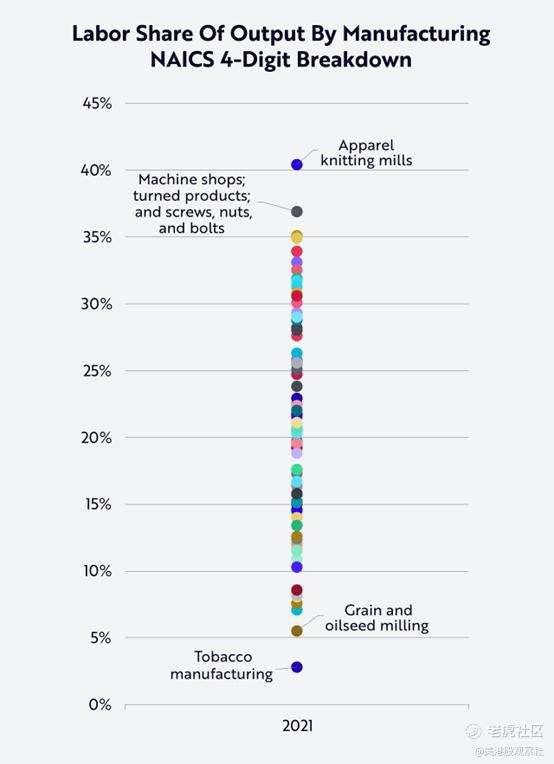 在制造业的各个子行业中,薪酬占收入的比例差别很大。如下图所示,2021年,烟草制造业占3%,谷物和油籽加工占6%,机械车间(包括旋转产品、螺丝、螺母和螺栓)占37%,服装针织厂占40%。