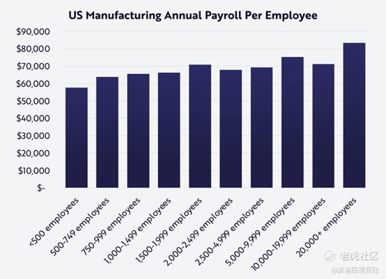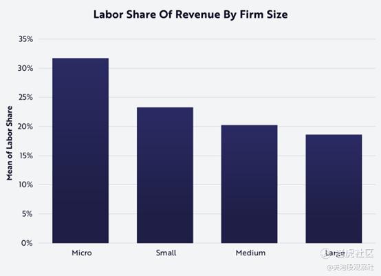与小型公司不同——在小型公司中,员工可能会“身兼数职”——大型制造公司是由专业化和自动化任务组成的。因此,随着时间的推移,它们的生产力一直是最小公司的两倍多。专业化和自动化使大型公司有能力显著扩大规模,反过来,降低劳动力成本在收入中所占的份额。因此,有些违反直觉的是,大公司通常比小公司支付更高的工资,因为自动化特定任务通常在大公司中提高生产力的程度比在小公司中更多,如下两张图所示。