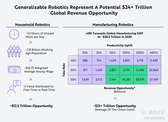 虽然马斯克设想的是超越人类能力的人形机器人,但即便在那个时刻之前,如果人形机器人能够大规模运作,它们可能会产生约24万亿美元的收入,根据Ark的研究,这些收入大致平均分配在家庭和制造业机器人之间,如下图所示。