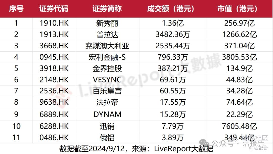 以今日成交金额计,新秀丽以1.36亿港元位居成交额首位,普拉达、兖煤澳大利亚分别为3482.36万港元及2535.44万港元,其余普遍数十至百万港元,而迅销、俄铝的日成交额分别仅为7.79万港元、3.89万港元。