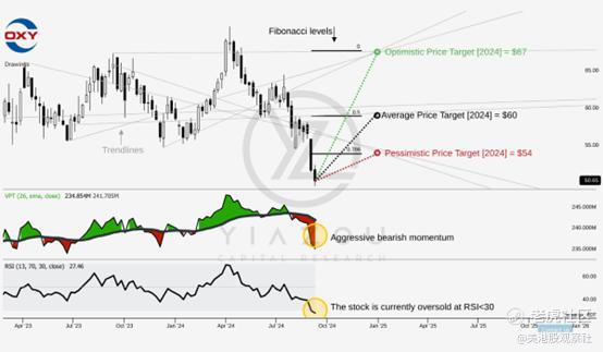 西方石油目前交易价约为51美元,平均目标价为60美元,与0.5斐波那契回撤位一致。这表明基于过去价格走势的中位阻力点。67美元的乐观目标对应于0斐波那契水平,这表明如果股价回到之前的高点,将有很大的上涨潜力。相反,54美元的悲观目标锚定在0.786斐波那契水平,这反映了假设近期跌势温和复苏的更为保守的前景。