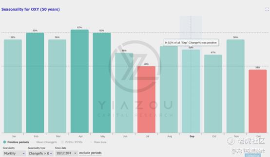 对西方石油过去50年的季节性分析表明,9月份出现正收益的概率为50%。历史趋势显示,1月、3月、4月和5月的正回报率较高,范围在56%到62%之间。与此同时,7月和12月等月份的正回报率较低,反映出这两个月的季节性表现较弱。投资者在选择交易时机时可能会考虑这些季节性趋势,因为9月份股市上涨的可能性不大。