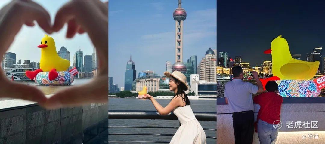 黄浦江上高达20米的巨型艺术鸭化身「沪飘」,在高楼林立的城市天际线衬托下显得格外别致。从四面八方赶来的人们或比心、或「拿捏」、或托举,努力在不同点位上留下互动感十足的打卡照;