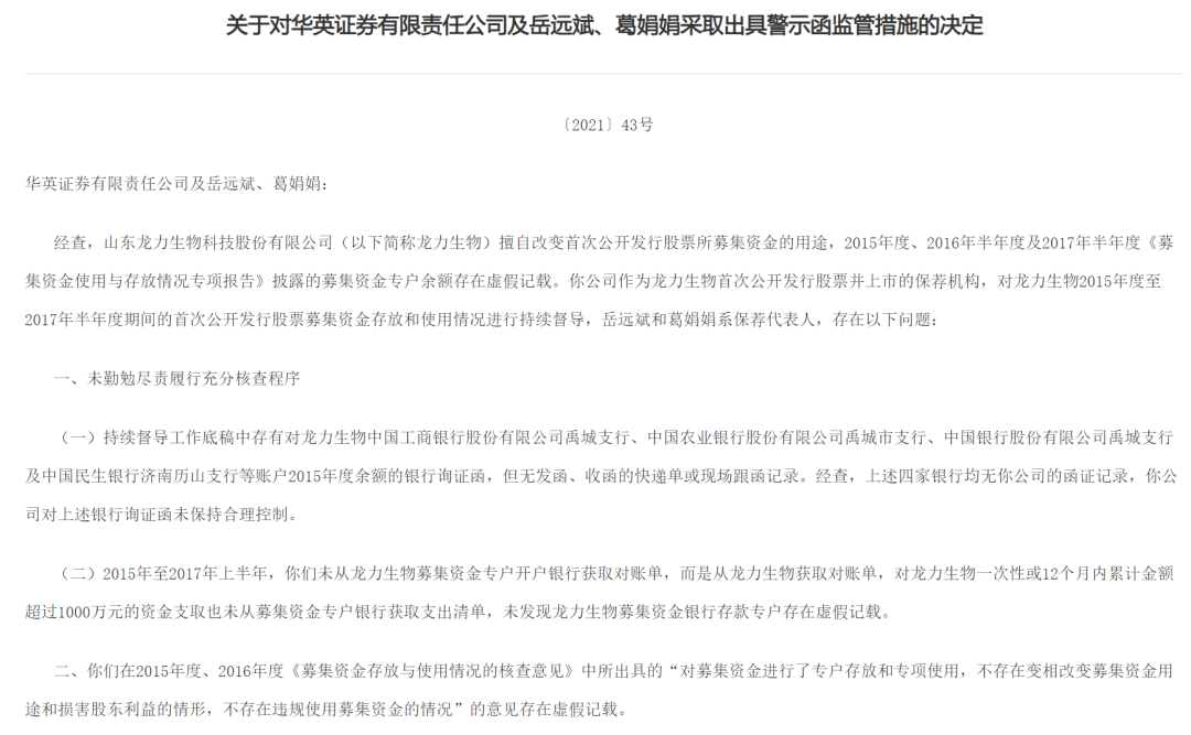 而2021年11月,华英证券再因龙力生物领罚。山东证监局对华英证券及两保代出具警示函,经查,华英证券作为龙力生物首次公开发行股票并上市的保荐机构,岳远斌和葛娟娟作为保荐代表人,存在未勤勉尽责履行充分核查程序、所出具意见存在虚假记载等违规行为。