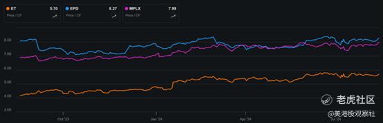 以目前16.17美元的价格,Energy Transfer的市价现金流比率为5.7倍,这如下图所示,与其同行Enterprise Products Partners的8.3倍和MPLX LP的8.0倍相比,有显著的折扣。