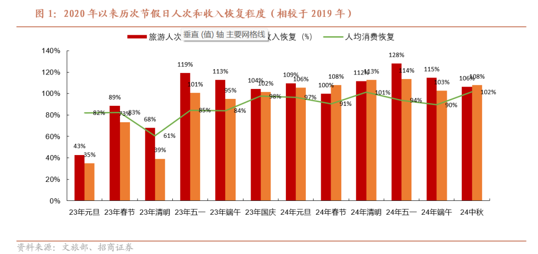 1.整体情况:人次&收入同比19年小幅增长,整体数据符合预期。经文化和旅游部数据中心测算,中秋节期间全国国内旅游出游合计1.1亿人次,按可比口径恢复至2019年同期的106.3%;实现国内旅游收入510.5亿元,恢复至19年同期的108.0%,人均旅游开支469.6元,恢复至19年同期101.6%。综合来看,今年中秋节期间国内居民出游意愿良好,旅游人次、人均支出同比19年小幅增长,出行人次恢复度环比端午(114.6%)、五一(128.2%)假期小幅回落,但人均消费能力有所恢复且超19年同期(24年端午、五一人均消费同比19年恢复度分别为93.7%/89.5%),受国庆节长假后置以及局部区域极端天气影响,本地游、周边游需求更为旺盛,高性价比出行盛行,整体出行数据符合预期。