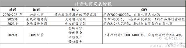 通过《抖音电商发展阶段》统计表中发展数据可以明显的看出抖音从2020年成立电商一级事业部以来,出现了外引电商 > 自有电商/货架电商 > 全域电商三个形态的更迭;GMV的销售额(或目标)也从7000亿按照每年80%以上的速度增长为2024年的3.5万亿。