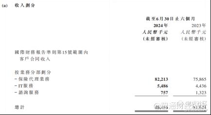 众淼控股收入增速放缓,主要原因之一是公司业务仍然依赖保险代理业务。2021年至2023年,公司保险代理业务的收入分别为1.16亿元、1.31亿元及1.56亿元,分别占总收入的96.7%、88.1%及89.5%。2024年上半年,保险代理业务实现收入8221.3万元,占总收入比重92.94%。
