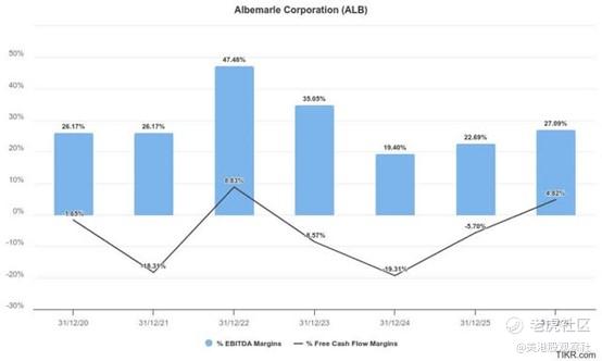 如上图所示,在锂价格于2022年见顶后的整个周期中,美国雅保调整后的EBITDA盈利能力保持相对强劲。尽管如此,该公司的自由现金流盈利能力已大幅下滑,预计今年将见底。尽管有复苏的可能性,但该公司预计要到2026财年才能实现自由现金流盈利,这加大了未来两年的潜在执行风险。