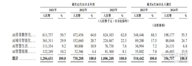 招股书显示,特斯联2021年至2024年上半年,收入分别为,12.07亿、7.38亿元、10.6亿元和3.57亿元,累计收入33.62亿元;其收入主要分为AI产业数智化、AI城市智能化、AI智慧生活、AI智慧能源四类。