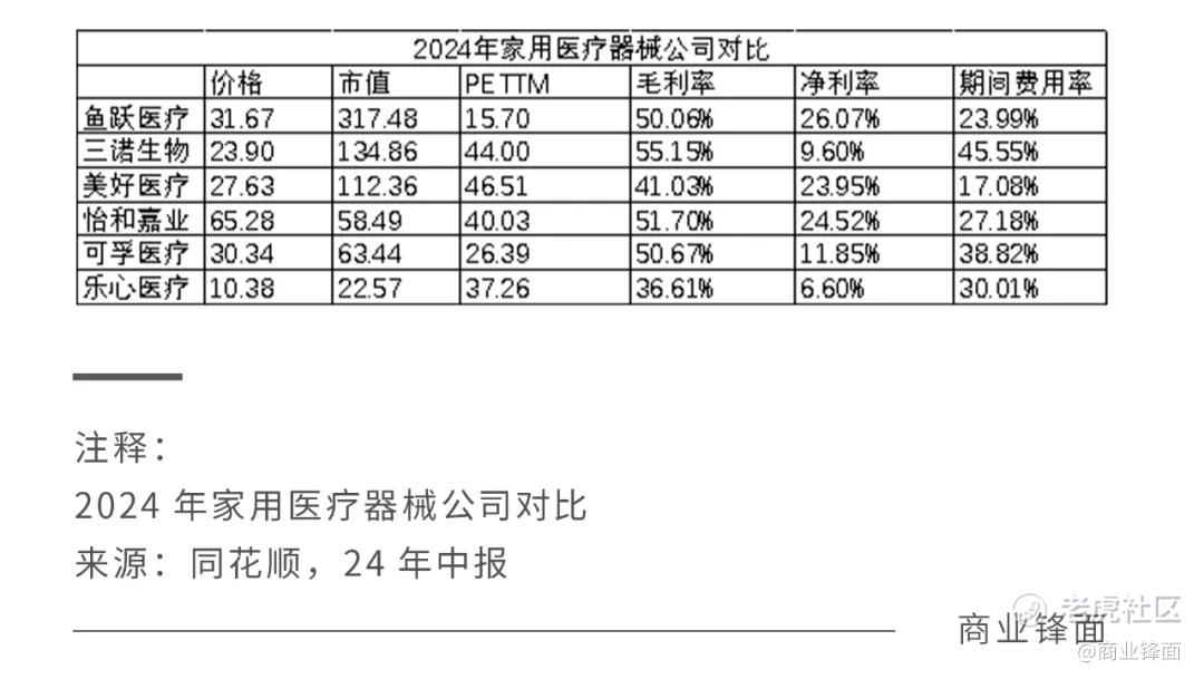 最后在看下可孚医疗, 这家公司21年上市,虽然产品多元化,但是既卖自有品牌也卖代理品牌。商业模式是依托于自身的线上电商和线下门店的渠道优势,再通过对于用户和市场的了解不断推进产品的自产化。从毛利上来看,其成熟的业务如康复辅具,医疗护理类毛利都较高,而存在代理品牌的呼吸支持类和健康检测类业务毛利较低。但其总毛利呈现上升趋势,在24年以前都在50%以下,在今年中报达到了50%以上,这是产品逐渐自产化导致的。在期间费用上,销售费用率较高,研发费用率较低,并压缩管理费用也是由于其营业模式导致的。