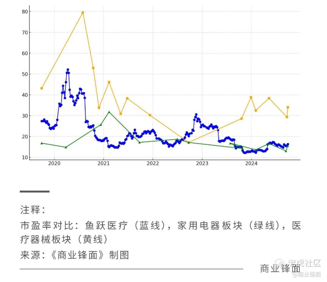 通过上面这张市盈率对比图可以看出,在疫情刚开始的2020年鱼跃的市盈率和整个医料器械板块的市盈率走势同步,但在随后几年里就开始更倾向于家用电器板块。而在近一年里其市盈率与医疗板块越走越远,已经基本和家用电器板块同步并重合了。这说明市场正在以家用电器行业的市盈率给予鱼跃估值,这就解释了开始的问题,为什么鱼跃市盈率是行业最低,那么你认为鱼跃医疗是否被低估了呢?