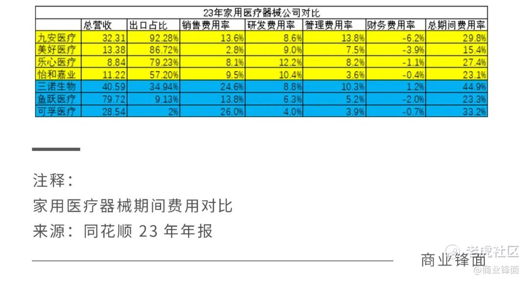再来看怡和嘉业,作为呼吸机行业龙头,市占率国产第一,境外业务占比57%。从毛利上比较,鱼跃的呼吸治疗解决方案业务毛利较高约56%,怡和嘉业家用呼吸诊疗产品毛利约为40%,耗材(比如呼吸机面罩)65%,国内平局毛利约50%。但从产品定位上来看,怡和嘉业的呼吸机比鱼跃定位更加高端,价格相对较高。这里看似有些矛盾,产品拥有高毛利一般有两个原因,第一产品科技含量带来的高附加值和定价权,第二产量较大通过规模效应降低成本。而怡和嘉业从市场份额和产品定位都比鱼跃要高,毛利却低于鱼跃。细观下,以2020年为例,怡和嘉业国内家用呼吸机市占率上远远领先于鱼跃,但是其业务规模只有3.07亿,而鱼跃的呼吸与供氧业务达到了22.6亿,这说明鱼跃在雾化器,制氧机等呼吸相关的产品销量上远远高于怡和嘉业,而这些产品可能具有更高的毛利。另一方面,鱼跃呼吸相关产品毛利在2020年前一直低于50%,在2020年达到了近62%的水平,随后几年都保持在55%左右。而怡和嘉业22年才上市,其境内业务在2020年前的毛利一直在50%以上,在20年达到顶峰68%,但在21年和22年出现下滑,平均在44%左右,在23年才重新回到50%。综上可见鱼跃在呼吸相关业务的高毛利来源于,一是产品多元化带来的高毛利,二是疫情导致的呼吸相关业务近两倍的营收增长带来的规模效应(2019年12亿增长到2020年22.6亿),三可能是品牌效应和用户人群的精准定位。从期间费用角度来看,怡和嘉业的销售费用率和管理费用率都较低,由于主做国外市场并且总营收规模较小导致,而研发费用率较高,因为主打高端市场,需要更多的研发创新。