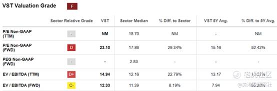 正是由于这个原因,尽管Vistra的5年平均值分别为7.94倍/ 15.16倍,公用事业板块中位数分别为11.39倍/ 17.86倍,但该股的估值并不过高,其FWD EV/ EBITDA估值为12.33倍,非GAAP市盈率为23.10倍。