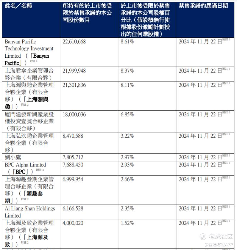 QFUN、刘小鹰先生、QFUN Tech、上海源及致、上海源与趣、源趣三期等,该等所有投资者的股份将于2024年11月22日正式解禁。
