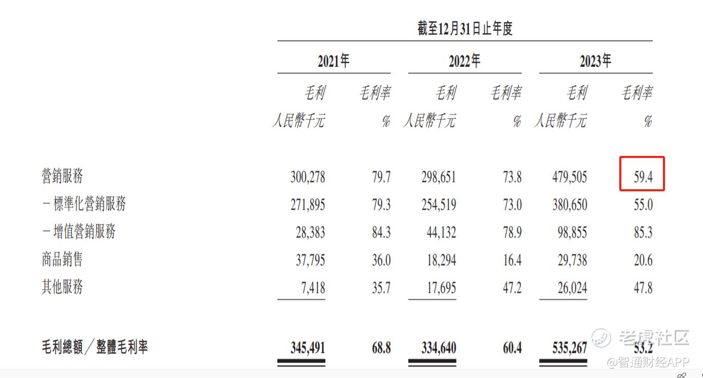 据招股书显示,2023年时,趣致集团营销业务的毛利率为59.4%,同比下滑近14个百分点,其中,标准化营销服务的毛利率为55%,同比下滑18个百分点,从而拖累公司2023年的整体毛利率下降约7个百分点之53.2%。