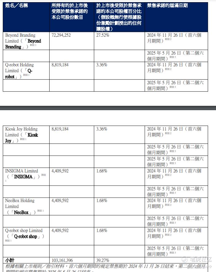 同时,趣致集团控股股东的股份也将于2024年11月26日有条件解除禁售。据发售文件显示,趣致集团的控股股东由6位一致行动人组成,共计持有趣致集团39.27%的股份。这6位一致行动人的股份将在2024年11月26日迎来首个禁售承诺的届满日期,控股股东可于该日期后出售或转让股份,但必须在确保仍为控股股东的前提下进行。而到2025年5月26日时,控股股东第二个禁售期届满,届时控股股东的出售或转让将无任何条件限制。目前并不排除控股股东在首个禁售期结束便开始减持的可能。