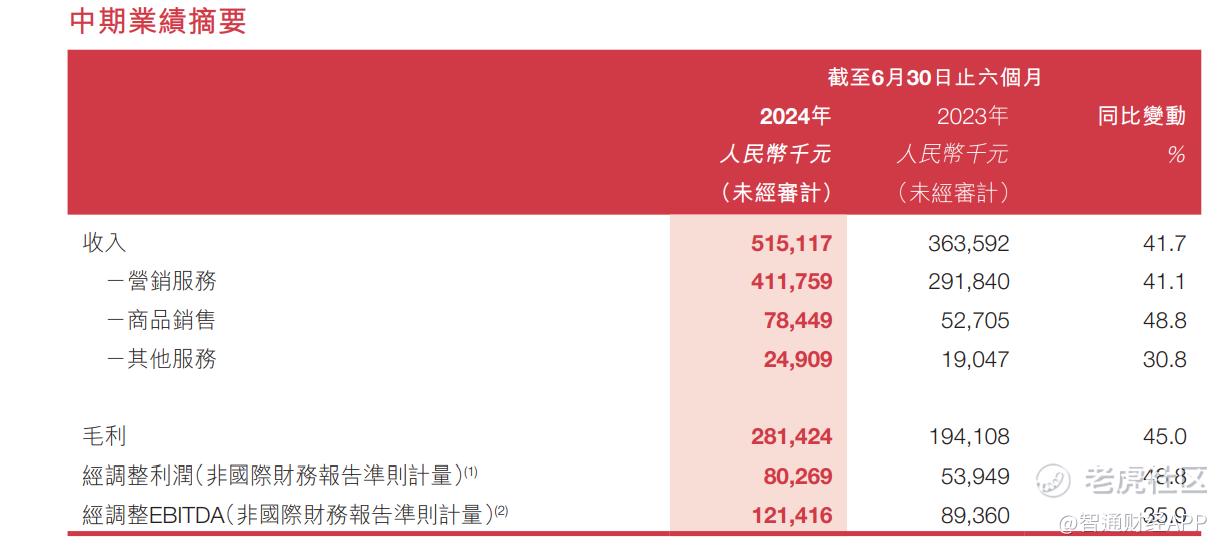 拆分来看,收入端三大业务均实现了快速增长,这与国内消费需求自疫情影响结束后持续恢复,消费市场整体规模稳步扩大有直接关系。其中,营销服务收入增长41.1%,这主要得益于公司战略性的增强利用社交媒体平台交付标准化的营销服务所带动,期内为171名品牌客户提供了营销服务,较去年同期增加了41名,且服务的大客户数量为30名,来自大客户的每名客户平均收入为1060万元,大客户数量及单价均实现了增长。